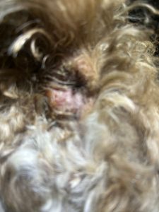 Andrea war einige Tage vorher ohne Pepper verreist – möglicherweise empfand er es als ungerecht, dass er nicht mit dabei war. Er bekommt Akazienfaser im Futter, um über die Ballaststoffe den Stuhl fest zu halten. Ein Analdrüsenabszess beim Hund kann entstehen, wenn die Flüssigkeit in den Analdrüsen verbleibt – sie wird durch festen Kot beim Lösen quasi nach draußen massiert. Vielleicht wurde das in den Tagen ihrer Abwesenheit nicht ganz stringent gegeben. Erschwerend kommt in Peppers Fall dazu, dass er sehr dichtes lockiges Fell überall am Körper hat, so auch am After, was die Einschätzung des entzündlichen Vorgehens enorm erschwert.