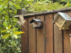Seit letztem Jahr können wir einen Buntspecht beobachten, der sich zunächst am benachbarten Insektenhotel bediente – inzwischen hat er (oder vielleicht sind es auch mehrere) festgestellt, dass der Inhalt der Töpfe leckerer ist – und nun ignorieren sie das Insektenhotel und bedienen sich an der Erdnussbutter.